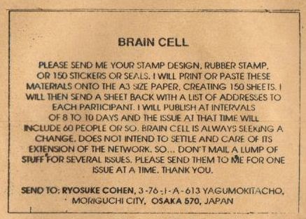 The Embassy of Utopia and "E" need your help … We would like to reconstitute the totality of sheets "brain cell" since N°1. For the archives of the embassy, thank you for sending to us "brain cell" of Ryosuke Cohen. Original or good scans with the list of the participants. The totality of sheets "brain cell" listed will be posted on this blog http://brain-cell-compilation.blogspot.com/